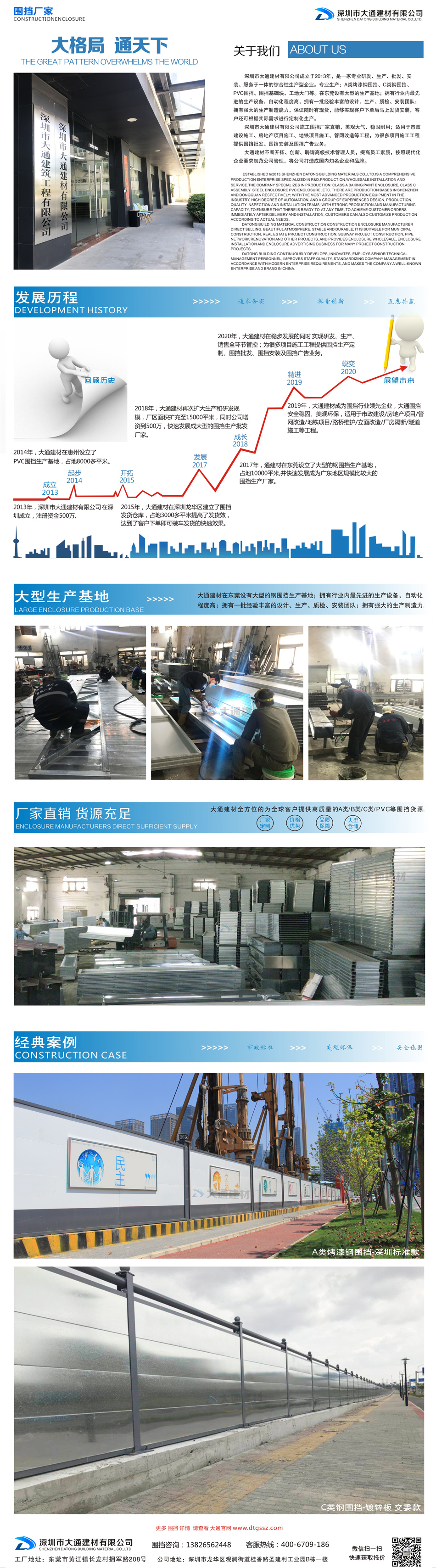 深圳市大通建材有限公司專業(yè)生產(chǎn):A類烤漆鋼圍擋深圳標(biāo)準(zhǔn)款/半龍骨款、C類鋼圍擋烤漆款/鍍鋅板款、PVC圍擋、圍擋基礎(chǔ)、工地大門等。在東莞設(shè)有大型的生產(chǎn)基地;擁有行業(yè)內(nèi)最先進(jìn)的生產(chǎn)設(shè)備,自動(dòng)化程度高,擁有一批經(jīng)驗(yàn)豐富的設(shè)計(jì)、生產(chǎn)、質(zhì)檢、安裝團(tuán)隊(duì);擁有強(qiáng)大的生產(chǎn)制造能力,保證隨時(shí)有現(xiàn)貨,能夠?qū)崿F(xiàn)客戶下單后馬上發(fā)貨安裝,客戶還可根據(jù)實(shí)際需求進(jìn)行定制化生產(chǎn)。